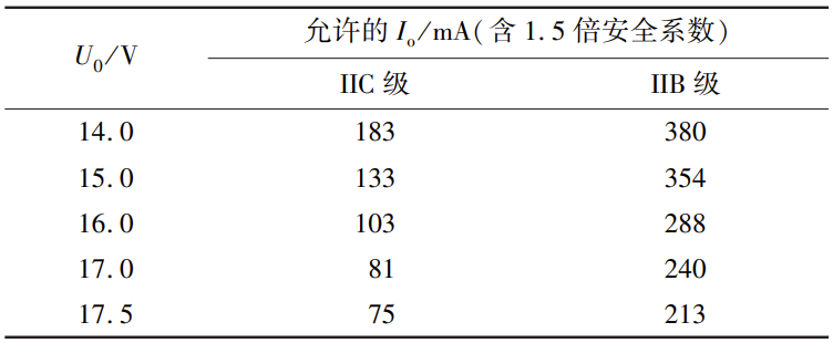 在考慮直流供電電壓和可能的通信電壓情況下,供電電源端口的最大輸出電壓U0應大于等于14 V且小于17.5 V。對于具有線性輸出特性的供電電源端口,最大輸出電流Io應根據GB/T 3836.4標準規定的要求確定,但不應超過380 mA。對于具有矩形輸出特性的供電電源端口,Io應滿足最大輸出電流要求。矩形輸出特性電源端口允許的最大輸出電流如表1所示。