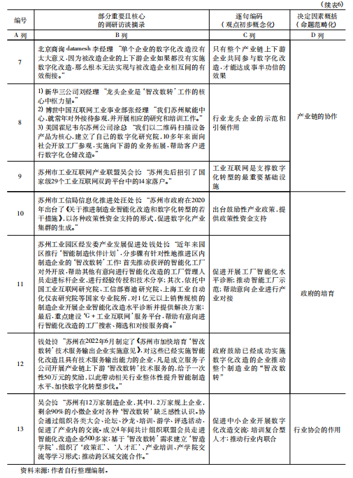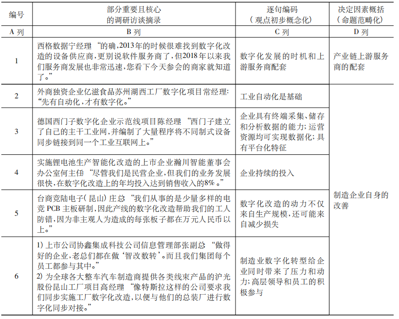 隨后,在初步概念化的基礎上,繼續(xù)按照縱向產(chǎn)業(yè)鏈上各參與者觀點,對數(shù)字化改造的決定因素這一命題進行范疇化,參見表6D列,整個范疇化過程的分析如下:
