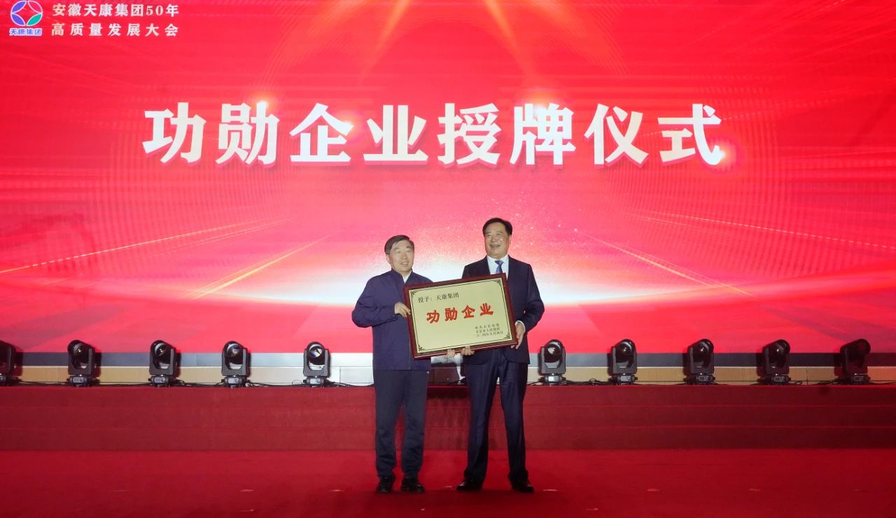 天長市委書記賀家平為安徽天康集團(tuán)頒授了 “功勛企業(yè)”榮譽(yù)牌匾。