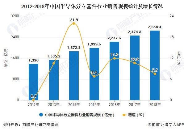 據(jù)半導(dǎo)體行業(yè)協(xié)會(huì)統(tǒng)計(jì)數(shù)據(jù)顯示, 2012年至2018年國(guó)內(nèi)半導(dǎo)體分立器件市場(chǎng)需求保持了11.41%的年均復(fù)合增長(zhǎng);2018年國(guó)內(nèi)半導(dǎo)體分立器件市場(chǎng)需求達(dá)到2699.8億元,同比2017年的2458.1億元增長(zhǎng)率達(dá)到9.8%,繼續(xù)保持著高速增長(zhǎng)趨勢(shì)。其中,半導(dǎo)體功率器件仍是帶動(dòng)中國(guó)半導(dǎo)體分立器件市場(chǎng)加速增長(zhǎng)的主要?jiǎng)恿Α?/span>