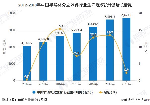 下游市場(chǎng)需求直接拉動(dòng)了半導(dǎo)體分立器件的生產(chǎn)規(guī)模。改革開(kāi)放以來(lái),特別是進(jìn)入21世紀(jì)后,我國(guó)半導(dǎo)體分應(yīng)器件行業(yè)內(nèi)企業(yè)不斷增加,分立器件的產(chǎn)量隨之攀升;2012年,我國(guó)半導(dǎo)體分立器件的整體生產(chǎn)規(guī)模為4606.8億只,至2018年增長(zhǎng)至7471.1億只,年均復(fù)合增長(zhǎng)率達(dá)到8.82%。