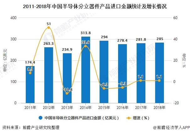 半導(dǎo)體行業(yè)發(fā)源于歐美,日韓及中國(guó)臺(tái)灣在產(chǎn)業(yè)轉(zhuǎn)移中亦建立了先進(jìn)的半導(dǎo)體工業(yè)體系。中國(guó)半導(dǎo)體起步晚、追趕難度較大。近年來(lái),我國(guó)高度重視半導(dǎo)體行業(yè)的發(fā)展,不斷出臺(tái)多項(xiàng)鼓勵(lì)政策大力扶持包括分立器件在內(nèi)的半導(dǎo)體行業(yè),半導(dǎo)體分立器件行業(yè)已獲得長(zhǎng)足發(fā)展,并逐步形成對(duì)國(guó)外產(chǎn)品的替代。據(jù)中國(guó)半導(dǎo)體行業(yè)協(xié)會(huì)統(tǒng)計(jì),2011年至2014年中國(guó)半導(dǎo)體分立器件產(chǎn)品進(jìn)口額基本保持增長(zhǎng)趨勢(shì),2014年進(jìn)口額達(dá)313.8億美元。2017年中國(guó)半導(dǎo)體分立器件進(jìn)口金額為281.8億美元,相較于2014年進(jìn)口額下降了10.20%,2018年中國(guó)半導(dǎo)體分立器件進(jìn)口金額為285.0億美元,與2017年基本持平。