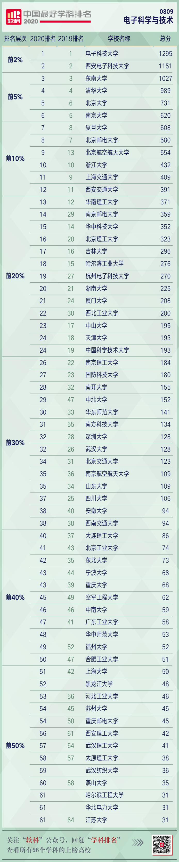 根據軟科2020最好學科排名,電子科學與技術學科有63所高校上榜,其中電子科技大學、西安電子科技大學位列前2%。