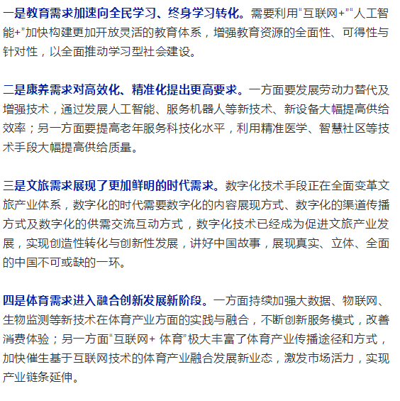 中國特色社會主義進入新時代,我國社會主要矛盾已經轉化為人民日益增長的美好生活需要和不平衡不充分的發(fā)展之間的矛盾。新時代對美好生活的需求在教育、醫(yī)療健康、養(yǎng)老、托育、家政、文化和旅游、體育等社會服務領域產生了新變化,需要利用新技術以更高效率、更好質量滿足新興需求。新興需求是戰(zhàn)略性新興產業(yè)發(fā)展的重要拉動力,隨著數字技術的不斷興起,以數字文化、數字教育、數字醫(yī)療等為代表的戰(zhàn)略性新興服務業(yè)在不斷涌現,它們通過實現創(chuàng)新發(fā)展與跨界融合,促進社會服務數字化、網絡化、智能化、多元化、協(xié)同化,以更好地滿足美好生活的新需求。