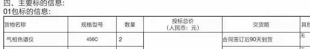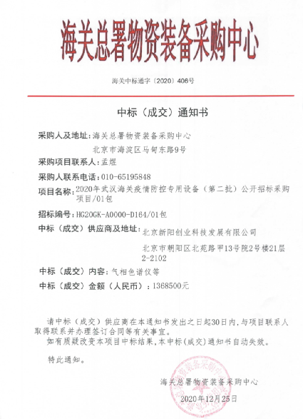 近日,海關(guān)總署物資裝備采購(gòu)中心發(fā)布項(xiàng)目中標(biāo)結(jié)果,此次招標(biāo)為2020年武漢海關(guān)疫情防控專用設(shè)備(第二批)公開招標(biāo)采購(gòu)項(xiàng)目,招標(biāo)文件編號(hào)HG20GK-A0000-D164,招標(biāo)采購(gòu)共3包,涉及氣相色譜儀、便攜式核酸檢測(cè)箱、熒光定量PCR儀等相關(guān)設(shè)備,天美公司2臺(tái)賽里安456C氣相色譜儀成功入選。