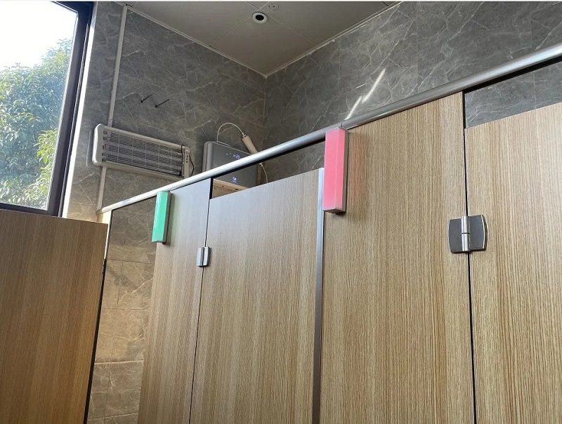 3.快速找空位:傳統(tǒng)公廁進(jìn)入后,有時(shí)很難確定廁位是否有人,隔間門口的紅綠色標(biāo)志不清晰,總要挨個(gè)拉開來(lái)判斷。有了智慧公廁,這一問(wèn)題便可以完美解決。每個(gè)廁位隔間上方都安裝了一個(gè)紅外傳感設(shè)備,當(dāng)使用者進(jìn)入后將門反鎖,廁位門上的燈柱便會(huì)自動(dòng)由綠色轉(zhuǎn)為紅色,顯示該廁位“有人”,使廁所使用情況一目了然。