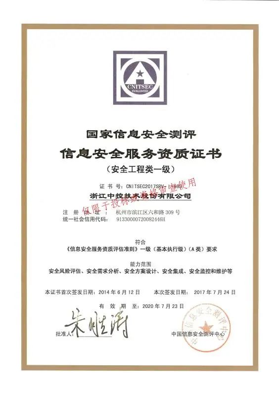近期,中控技術成功取得信息安全的服務認證——安全集成、安全運維、風險評估方向三級(中國網絡安全審查技術與認證中心)及信息安全服務資質——安全工程類一級(中國信息安全測評中心)兩項資質。