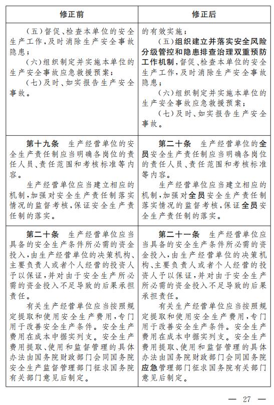 二、將第四條修改為:“生產經營單位必須遵守本法和其他有關安全生產的法律、法規,加強安全生產管理,建立健全全員安全生產責任制和安全生產規章制度,加大對安全生產資金、物資、 人員的投入保障力度,改善安全生產條件,加強安全生產標準化建設,構建安全風險分級管控和隱患排查治理雙重預防體系,健全風險防范化解機制,提高安全生產水平,確保安全生產。”