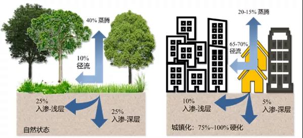 城市是人口高度聚集、社會(huì)經(jīng)濟(jì)也高度發(fā)達(dá)的地區(qū),是資源環(huán)境承載力矛盾最為突出的地方。改革開(kāi)放以來(lái),我國(guó)進(jìn)入了城鎮(zhèn)化快速發(fā)展階段,城鎮(zhèn)化率從1979年的不到20%,發(fā)展到當(dāng)今的60%左右,年均增幅接近1%。在傳統(tǒng)城市建設(shè)理念的影響下,城市開(kāi)發(fā)建設(shè)帶來(lái)的城市下墊面過(guò)度硬化,城市的“地穿甲”割裂了山水林田湖草的生態(tài)系統(tǒng),改變了原有的自然生態(tài)本底和水文特征,切斷了水的自然循環(huán)過(guò)程,破壞了城市水文徑流特征的原真性(見(jiàn)圖1);同時(shí),城市建設(shè)高強(qiáng)度開(kāi)發(fā)、填湖(塘)造地、伐林減綠,忽略或任意調(diào)整豎向關(guān)系等粗放做法,在加快降水產(chǎn)匯流的同時(shí),也加大了降雨徑流量和匯流峰值。