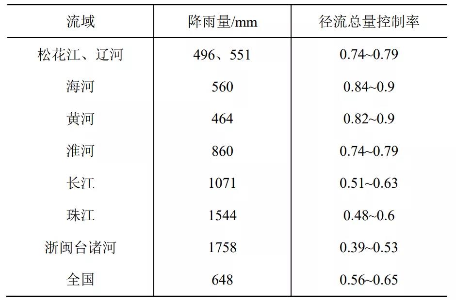 海綿城市建設(shè)是基于對(duì)自然本底的保護(hù)與修復(fù),因此確定徑流總量控制率時(shí)必須要掌握城市所在地的降雨自然徑流規(guī)律與特點(diǎn),依此來(lái)確定。當(dāng)?shù)氐淖匀粡搅饕?guī)律和特點(diǎn)與降雨量、下墊面狀況、土壤滲透性以及地下水位等因素有關(guān),可通過(guò)多年降雨形成產(chǎn)匯流的水文統(tǒng)計(jì)數(shù)據(jù)推導(dǎo)得出。在海綿城市建設(shè)初期推廣時(shí),住建部印發(fā)的《海綿城市建設(shè)技術(shù)指南》中給出了北京建筑大學(xué)研究團(tuán)隊(duì)收集國(guó)內(nèi)200多個(gè)城市降雨資料統(tǒng)計(jì)計(jì)算繪制的參考圖,供當(dāng)時(shí)試點(diǎn)城市和各地在確定徑流總量控制率時(shí)參考。筆者根據(jù)水利部水文局1986年《中國(guó)水資源評(píng)價(jià)》統(tǒng)計(jì)數(shù)據(jù)計(jì)算的徑流總量控制率見(jiàn)表2,地處流域中上游的城市可取上限值、下游城市可取下限值。