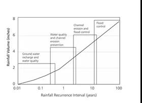 需要說(shuō)明的是,我國(guó)海綿城市依據(jù)年徑流總量控制率確定徑流控制設(shè)施規(guī)模與美國(guó)LID設(shè)施依據(jù)徑流污染水質(zhì)控制體積(Water Quality Capture Volume,WQCV)確定徑流控制設(shè)施規(guī)模的側(cè)重點(diǎn)是有所不同的。美國(guó)市政基礎(chǔ)設(shè)施完善程度及水體環(huán)境質(zhì)量要求較高,水污染控制的重點(diǎn)在點(diǎn)源污染治理基礎(chǔ)上逐步加強(qiáng)了面源污染控制,尤其是1977年頒布《清潔水法》(CWA)后,對(duì)初雨污染控制非常重視,WQCV更加側(cè)重控制初雨及徑流污染的LID設(shè)施的徑流體積控制設(shè)計(jì)(見(jiàn)圖4)。這方面我國(guó)尚有一定差距,一些基礎(chǔ)性研究工作也未跟上,因此,我國(guó)海綿城市還是依據(jù)自然下墊面對(duì)雨水徑流控制能力進(jìn)行設(shè)計(jì)的,控制徑流污染的水質(zhì)問(wèn)題尚未作為主要考慮因素。