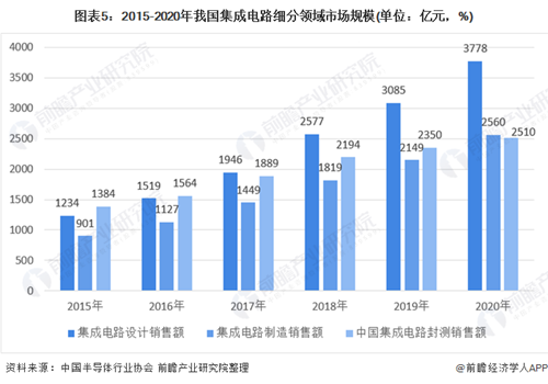 圖表5:2015-2020年我國集成電路細分領域市場規模(單位:億元,%)