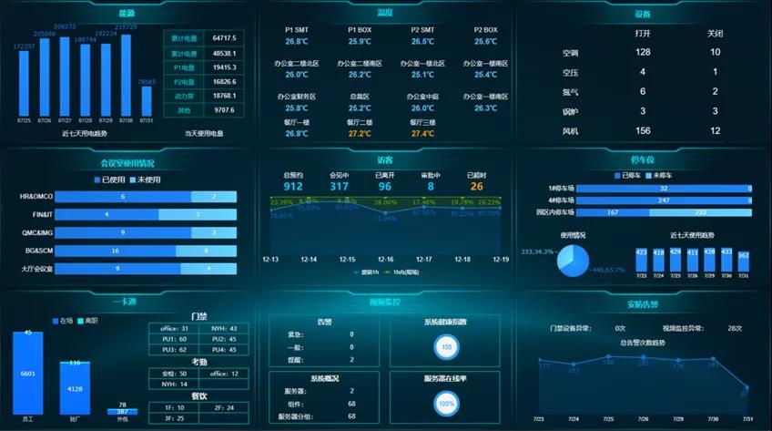 智慧工廠要求對園區(qū)的視頻監(jiān)控、安防報警、人員巡查、門禁考勤、訪客管理、一卡通管理、停車位、會議室、信息發(fā)布、能源使用情況、環(huán)境變化、設備參數(shù)等工作進行實時在線的統(tǒng)一管理,企業(yè)可利用傳感器技術實現(xiàn)動態(tài)捕捉、熱成像報警、人臉識別、溫濕度感應等,再利用OA或報表系統(tǒng)實現(xiàn)在線巡檢、信息發(fā)布、會議室線上預約、訪客線上登記等,將系統(tǒng)數(shù)據(jù)和傳感器數(shù)據(jù)利用微服務接口的方式進行調用,形成園區(qū)全貌管理指標,最后利用3D建模技術開發(fā)智慧園區(qū)全局管理模型或利用數(shù)據(jù)分析工具制作園區(qū)綜合管理駕駛艙,實現(xiàn)對園區(qū)資源的統(tǒng)一高效管理,打造綠色、高效、安全的智慧園區(qū)。