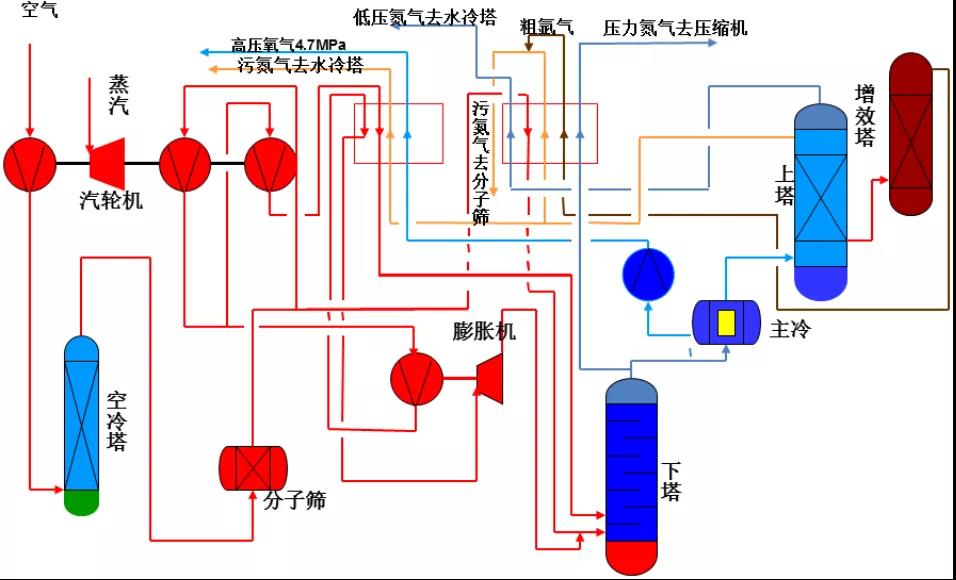 空氣分離裝置是利用物理或者化學方法將空氣混合物各組分分開,獲得氧氣、氮氣以及一些稀有氣體的過程。工業(yè)上主要有三種實現(xiàn)空氣分離方法:低溫法、吸附法、膜分離法。目前應(yīng)用廣泛的是低溫法,它的優(yōu)點是生產(chǎn)量大、產(chǎn)品純度高、電耗低并且可以得到液態(tài)產(chǎn)品,便于存儲和運輸,主要工藝單元包括:凈化系統(tǒng)、壓縮系統(tǒng)、冷卻系統(tǒng)、純化系統(tǒng)、膨脹系統(tǒng)、分餾系統(tǒng)。
