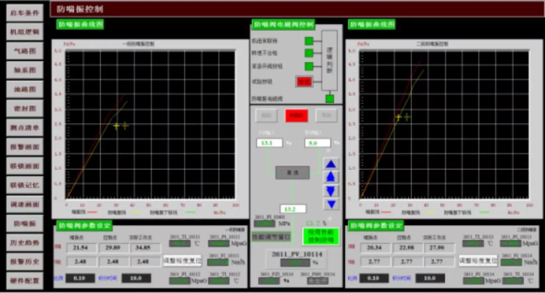 在機組啟動和停機過程中,由于機組流量過低,如果沒有防喘振控制,就會因喘振的發(fā)生對機組造成損壞。