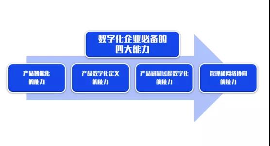 第三類是管理和協同軟件,負責復雜工業體系及復雜產品研制過程中多企業之間的相互聯通、管理和協同。由此,可以分解出未來企業必須具備的四大數字化能力。