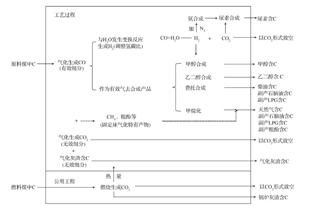 圖3 以煤氣化為龍頭的煤化工生產(chǎn)過程的碳流向示意