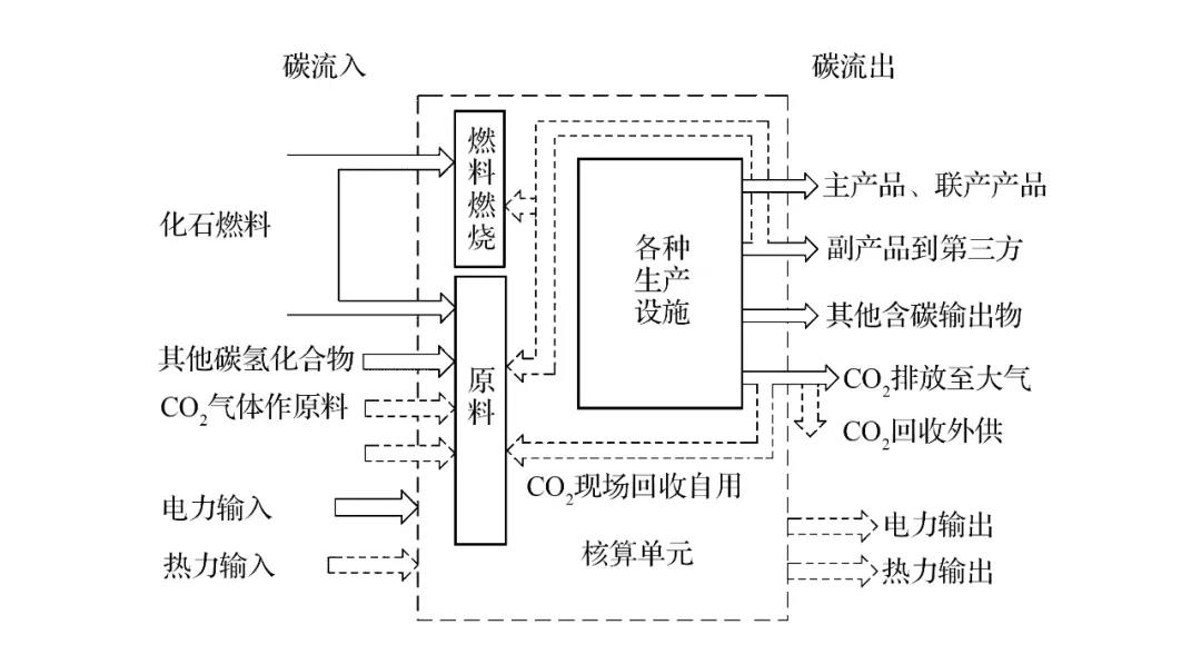 參照《溫室氣體排放核算與報告要求第10部分:化工生產(chǎn)企業(yè)》(GB/T32151.10—2015),化工生產(chǎn)企業(yè)的溫室氣體排放為各個核算單元的化石燃料燃燒產(chǎn)生的二氧化碳排放、生產(chǎn)過程中的二氧化碳排放和氧化亞氮等其他溫室氣體排放,以及購入電力、熱力產(chǎn)生的二氧化碳排放之和,同時扣除回收且外供的二氧化碳的量,以及輸出的電力、熱力所對應(yīng)的二氧化碳量。化工企業(yè)按圖2所示識別碳源流,并分別核算。