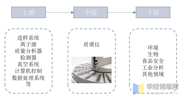 質譜儀產業鏈由上游組成部分、中游制造生產、下游應用領域三部分構成。上游組成部分主要包括進樣系統、離子源、質量分析器、檢測器、真空系統和計算機控制與數據處理系統等;中游是質譜儀器生產供應,包括各種類型質譜儀器;下游應用領域主要是環境、生物、食品安全、工業分析等領域。