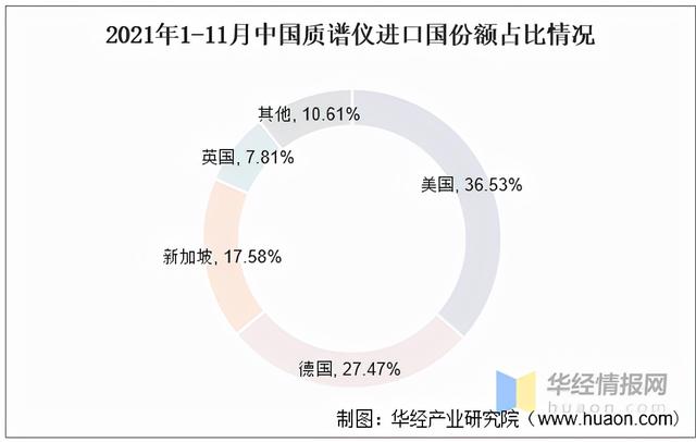 從進口國情況來看,我國主要在美國、德國、新加坡進口質譜儀高端產品。據統計,2021年1-11月,我國主要進口國數量分布情況為:美國(3223臺,占比36.53%)、德國(2424臺,占比27.47%)、新加坡(1551臺,占比17.58%)。