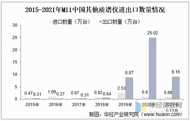 中國質譜儀對外依存度仍較大,主要從國外進口高檔產品?!捌渌|譜儀”海關編碼為“90278019”。從進出口數量情況來看,據統計,2021年1-11月,我國質譜儀進口數量為8958臺,出口數量為91520臺。
