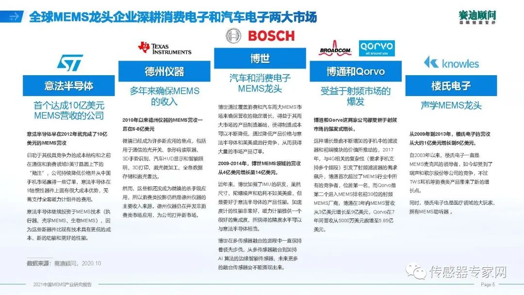 MEMS產(chǎn)業(yè)從上個(gè)世紀(jì)八十年代初開始規(guī)模應(yīng)用,經(jīng)過將近四十年的發(fā)展,已經(jīng)形成了一批國際上領(lǐng)先企業(yè),有ST、博通、博世,有一個(gè)特點(diǎn),日韓和臺(tái)灣企業(yè)比較少,主要是歐美企業(yè),縱觀經(jīng)濟(jì)變遷,包括新型顯示、集成電路都有這個(gè)特點(diǎn),現(xiàn)在MEMS產(chǎn)業(yè)領(lǐng)導(dǎo)廠商,仍然是美國和歐洲企業(yè)。