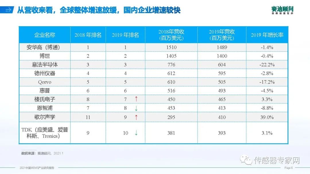 在全球MEMS廠商格局中,我們作為后來者,其實(shí)差距并不大,歌爾聲學(xué)現(xiàn)在是全球第九大廠商。在2019年全球不景氣的情況下,國內(nèi)企業(yè)依然保持高速的增長(zhǎng),再次引證國內(nèi)企業(yè)作為后發(fā)優(yōu)勢(shì),趕超正多其時(shí)。