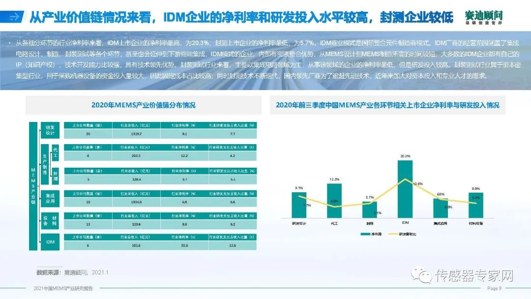 看投資收益、發(fā)展前景,實(shí)事求是的講,現(xiàn)在MEMS行業(yè)凈利潤率并不高,10%左右,IDM凈利潤率最高,超過20%,代工行業(yè)利潤率比較高,達(dá)到12%。在研發(fā)投入上,研發(fā)能力遠(yuǎn)遠(yuǎn)不足,基本上在10%,IDM比較高,超過了10%。