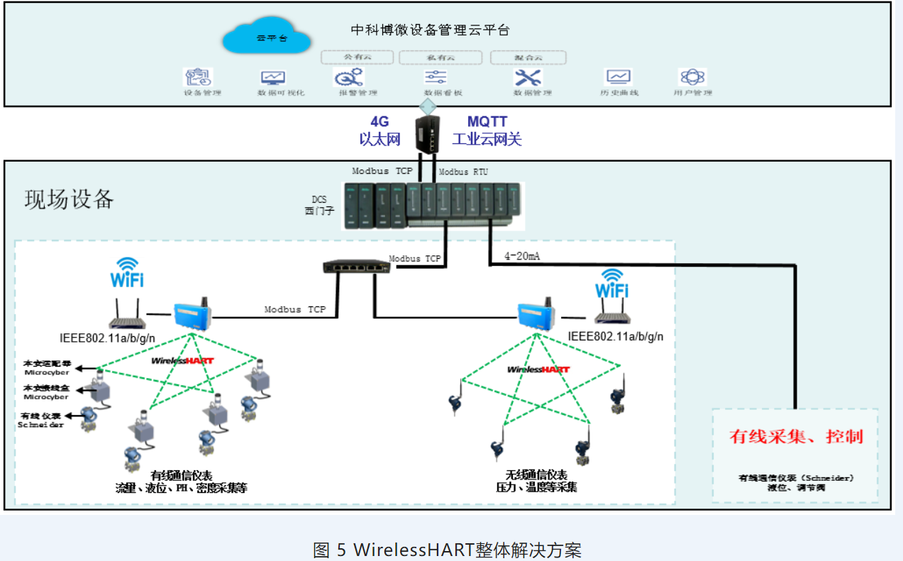 中科博微目前已經(jīng)將WirelessHART國產(chǎn)化產(chǎn)品研發(fā)逐步轉(zhuǎn)移打造適應(yīng)不同工況的WirelessHART產(chǎn)品整體解決方案階段,基于WirelessHART國產(chǎn)化產(chǎn)品,打通“上游”“下游”國產(chǎn)化保障渠道,開發(fā)設(shè)備管理軟件平臺(tái),如:NCS-View、NCS-AMS等,實(shí)現(xiàn)多協(xié)議無線網(wǎng)絡(luò)深度融合及數(shù)據(jù)互聯(lián),基于交叉融合特征的集成化創(chuàng)新、滲透輻射特征的跨領(lǐng)域創(chuàng)新,應(yīng)對(duì)疫情環(huán)境下帶來的行業(yè)商業(yè)模式創(chuàng)新,實(shí)現(xiàn)以工業(yè)物聯(lián)網(wǎng)架構(gòu)下的行業(yè)整體解決方案,逐步完成布局,建立并形成工業(yè)物聯(lián)網(wǎng)完善的生態(tài)圈建設(shè)。如圖5所示。