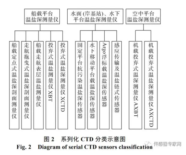 目前, 世界上主要海洋科技強(qiáng)國都擁有自己的 CTD 知名企業(yè), 包括美國 Seabird 和 RDI, 加拿大 AML 和 RBR、德國 Sea & Sun Technology、意大利 IDRONAUT、日本 ALEC 以及英國 VALPORT 等。其中,Seabird 公司的 CTD 傳感器產(chǎn)品在精度、可靠性等方面尤為突出, 占據(jù)了國內(nèi)外大多數(shù)市場份額。一般按照船載、水面和水下、機(jī)載 3 類搭載平臺(tái)對(duì) CTD 傳感器進(jìn)行系列化分類, 具體如圖 2所示。
