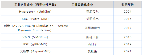 工業軟件的演進就是“大魚吃小魚”的過程。從20世紀90年代以來,收購和兼并成為國際 自動化企業擴張和數字化轉型的一個重要手段。進入21世紀以后,工業軟件的重要性日益凸顯,工業軟件成為自動化巨頭下半場爭奪戰的關鍵。西門子、施耐德電氣、愛默生、霍尼韋爾、海克斯康等工業硬件巨頭,紛紛加快并購優質工 業軟件企業,與自身的工業自動化、工業測量等拳頭產品形成軟硬一體的解決方案 。市場占有率靠前的商業流程模擬軟件全部被工業動化頭部企業收購,詳見表 1