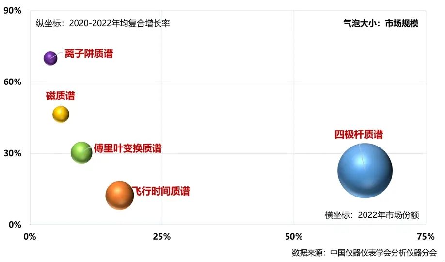 盡管離子阱質譜、磁質譜、傅里葉變換質譜的市場占比較低,但2022年這三類質量分析器質譜儀器的市場增速較快,2020-2022年均復合增長率高于30%,其中離子阱質譜的增速最高,主要貢獻來自于離子阱液質聯用儀、便攜式離子阱質譜。