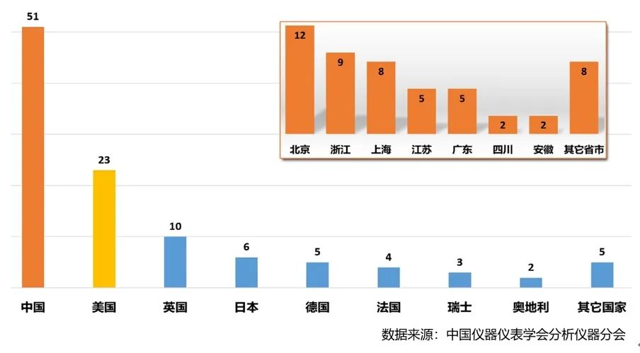 參見上圖,2022年國產自研質譜企業超過50家,主要分布在北京、浙江、上海、江蘇、廣東等省市,可見上述省市的質譜產業集聚趨勢較為突出。2022年活躍在中國市場的進口質譜企業近60家,其中40%的企業總部位于美國,需要說明的是,這23家美國質譜企業占據了國內半數以上的質譜市場份額;另有18%的企業總部位于英國,其余企業總部則分布在日本、德國、法國、瑞士、奧地利等國家。