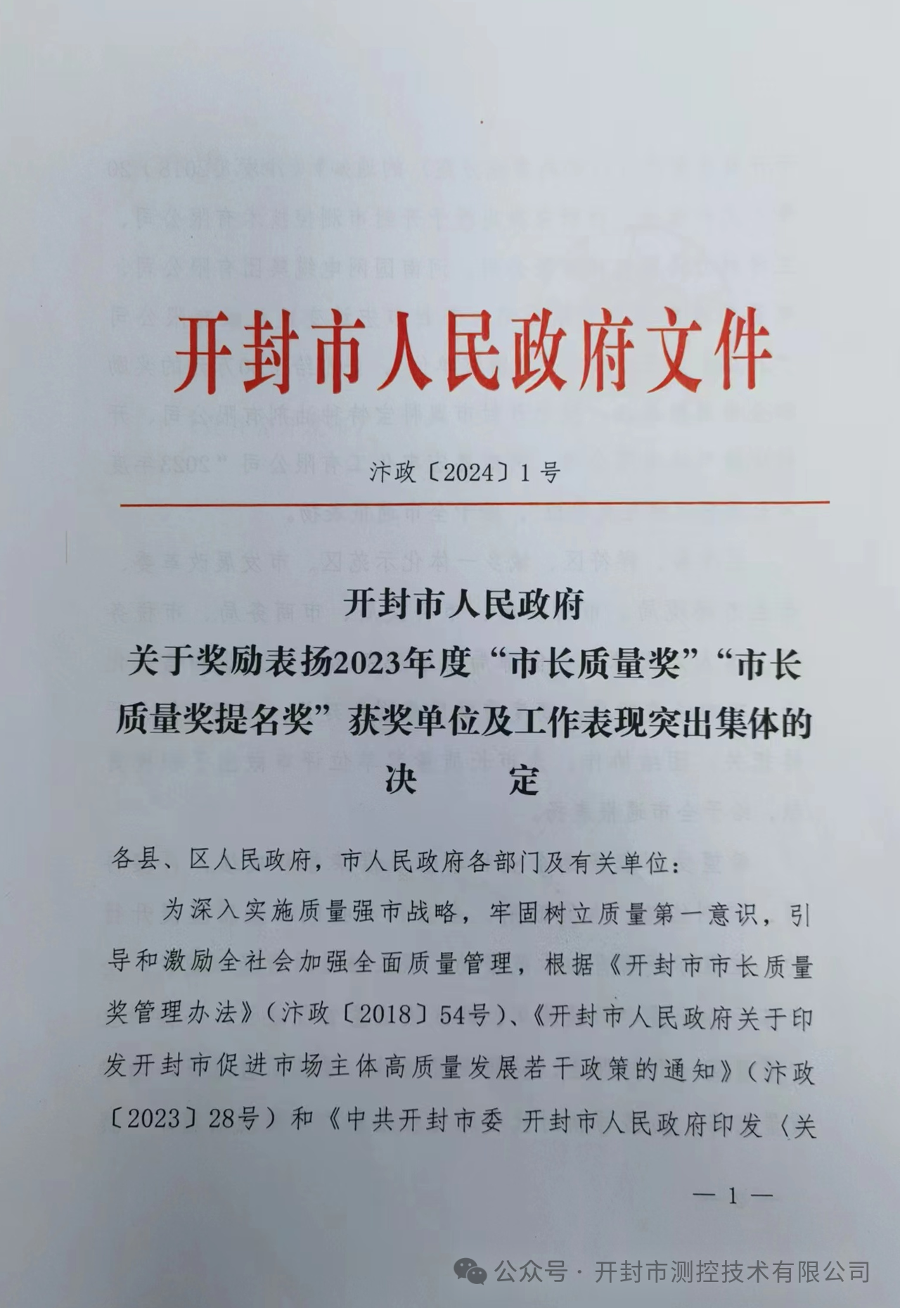 開封測控技術有限公司憑借其卓越質量管理方面的出色表現,榮獲了2023年度開封市“市長質量獎”,并在評比中榮登榜首。這一榮譽的獲得,無疑為開封測控技術有限公司再添殊榮,也進一步彰顯了其在行業中的領先地位和卓越品質。