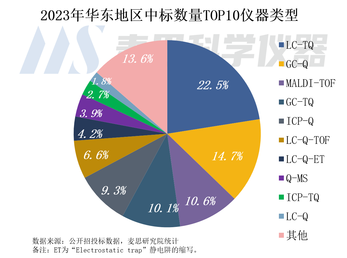 2023年華東地區(qū)中標(biāo)數(shù)量Top10儀器類型分別為LC-TQ、GC-Q、MALDI-TOF、GC-TQ、ICP-Q、LC-Q-TOF、LC-Q-ET、Q-MS、ICP-TQ和LC-Q,合計(jì)中標(biāo)數(shù)量占比86.4%。