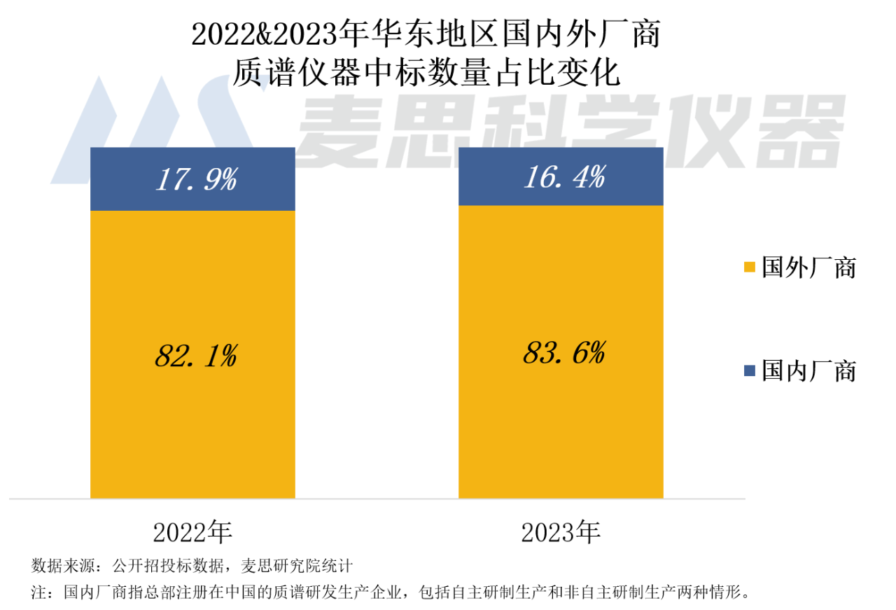 2023年華東地區(qū)國(guó)內(nèi)廠商中標(biāo)數(shù)量占比為16.4%,同比下降1.5個(gè)百分點(diǎn)。國(guó)外廠商中標(biāo)數(shù)量占比為83.6%,高于全國(guó)市場(chǎng)平均值(76%),占據(jù)市場(chǎng)主導(dǎo)地位。從二者占比變化可見,2023年國(guó)內(nèi)廠商的質(zhì)譜儀器中標(biāo)數(shù)量下降幅度高于國(guó)外廠商。