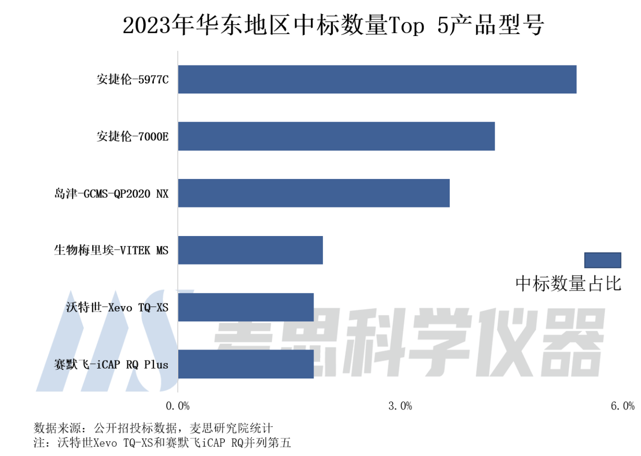 從產(chǎn)品型號(hào)來(lái)看,2023年華東地區(qū)質(zhì)譜儀器中標(biāo)數(shù)量Top 5產(chǎn)品分別為安捷倫-5977C、安捷倫-7000E、島津-GCMS-QP2020 NX、生物梅里埃-VITEK MS、沃特世-Xevo TQ-XS和賽默飛-iCAP RQ Plus(并列)。