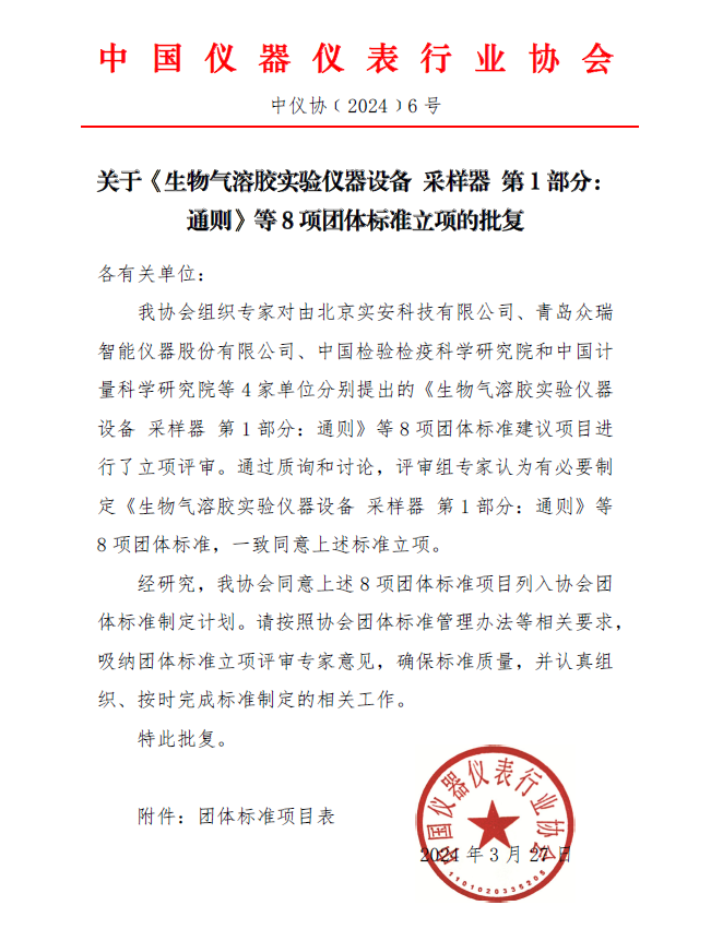 我協(xié)會組織專家對由北京實(shí)安科技有限公司、青島眾瑞智能儀器股份有限公司、中國檢驗(yàn)檢疫科學(xué)研究院和中國計量科學(xué)研究院等4家單位分別提出的《生物氣溶膠實(shí)驗(yàn)儀器設(shè)備 采樣器 第1部分:通則》等8項(xiàng)團(tuán)體標(biāo)準(zhǔn)建議項(xiàng)目進(jìn)行了立項(xiàng)評審。通過質(zhì)詢和討論,評審組專家認(rèn)為有必要制定《生物氣溶膠實(shí)驗(yàn)儀器設(shè)備 采樣器 第1部分:通則》等8項(xiàng)團(tuán)體標(biāo)準(zhǔn),一致同意上述標(biāo)準(zhǔn)立項(xiàng)。