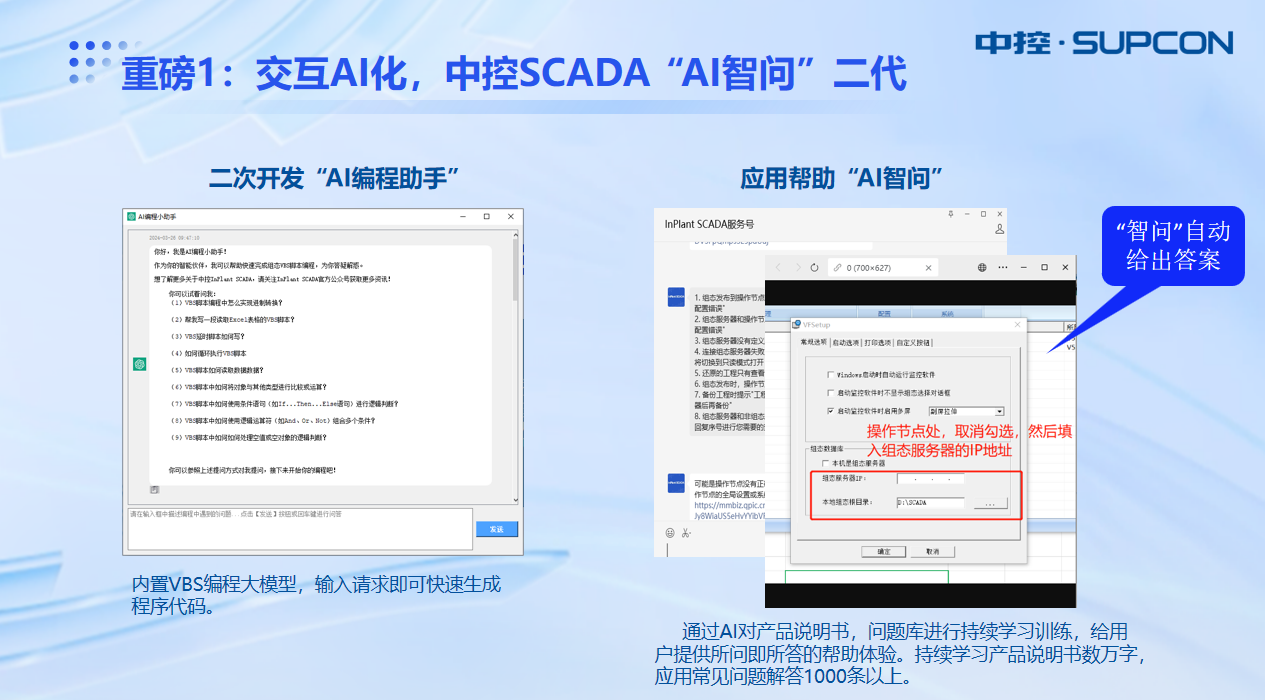 中控SCADA 6.5版本新增“AI編程助手”和“AI智問”兩種功能?!?/span>AI編程助手”內置VBS編程大模型,輸入請求即可快速生成程序代碼,能夠幫助用戶進行軟件功能的二次開發。“AI智問”經過大量訓練,已深入學習海量產品說明書及應用問題,能夠為用戶實時提供工程問題解答和指導,降低了人工答疑的時間損耗,實現工程搭建的效率提升。