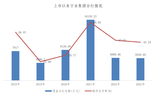 將時(shí)間線拉長。自2019年1月上市以來,寧水集團(tuán)已連續(xù)6年進(jìn)行現(xiàn)金分紅(2018年至2023年),十分重視業(yè)績(jī)?cè)鲩L對(duì)于股東的回報(bào)情況。數(shù)據(jù)顯示,自2021年公司分紅總額以及股利支付率雙雙抵達(dá)峰值后,寧水集團(tuán)近兩年的股息支付率均維持在45%以上。公司6次分紅金額累計(jì)高達(dá)4.87億元。