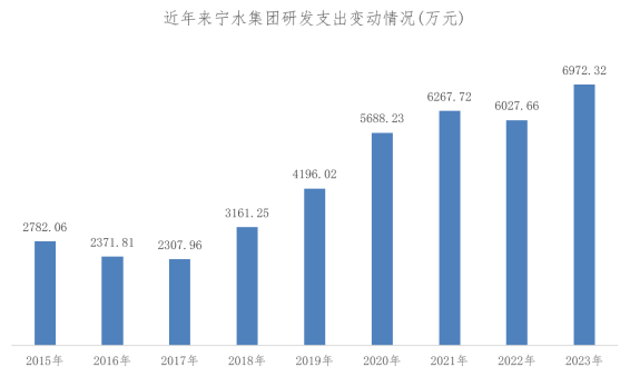 專利方面,報(bào)告期內(nèi),公司共申請(qǐng)發(fā)明、實(shí)用新型、外觀設(shè)計(jì)等各類專利77件,申請(qǐng)軟件著作權(quán)14件,取得型批證書22張,型評(píng)報(bào)告26份。2024年4月8日,國內(nèi)首張水表MID(計(jì)量器具指令)認(rèn)證證書落戶寧水集團(tuán)。從研發(fā)支出來看亦是如此。公司2023年研發(fā)支出6972.32萬元,同比增長15.67%,創(chuàng)下公司在研發(fā)方面投入的最高值。