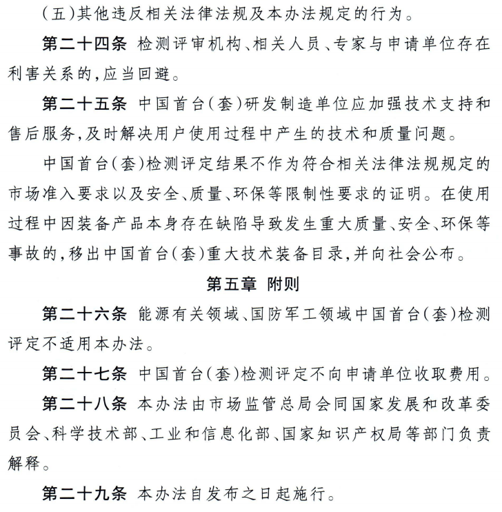 為促進我國重大技術裝備質量提升,支撐重大技術裝備攻關工程,推動制造業高端化、智能化、綠色化發展,加快推進新型工業化,市場監管總局、國家發展改革委、科技部、工業和信息化部、國家知識產權局5部門近日聯合印發《中國首臺(套)重大技術裝備檢測評定管理辦法(試行)》(以下簡稱《辦法》)。