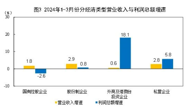 1-3月份,規模以上工業企業中,國有控股企業實現利潤總額5738.2億元,同比下降2.6%;股份制企業實現利潤總額11203.0億元,增長0.8%;外商及港澳臺投資企業實現利潤總額3737.5億元,增長18.1%;私營企業實現利潤總額3679.7億元,增長5.8%。