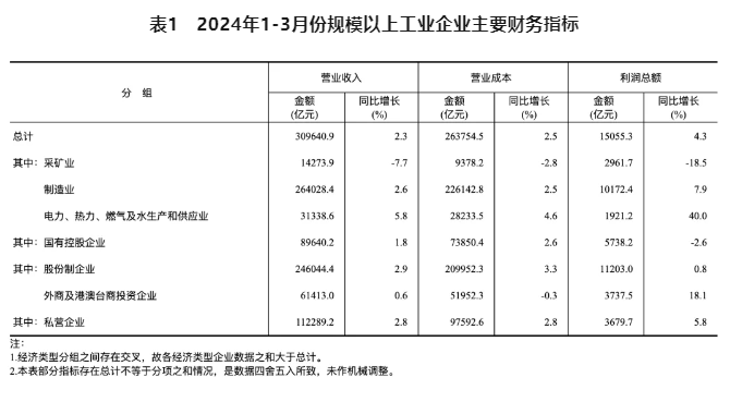 1-3月份,規模以上工業企業實現營業收入30.96萬億元,同比增長2.3%;發生營業成本26.38萬億元,增長2.5%;營業收入利潤率為4.86%,同比提高0.09個百分點。