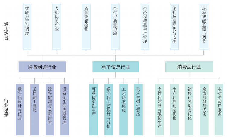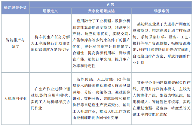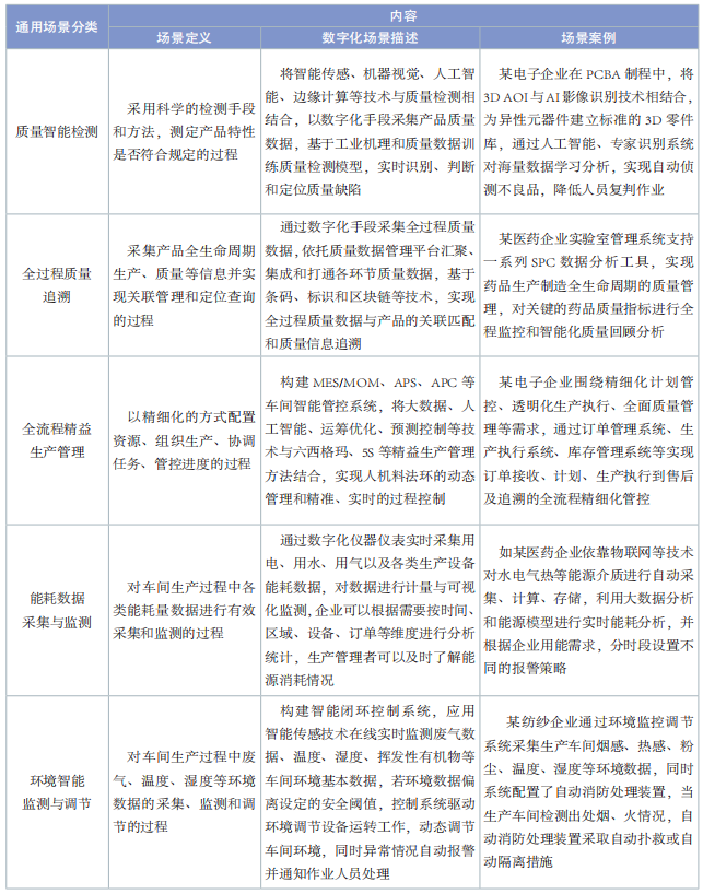 通用場景是指滿足不同行業(yè)數(shù)字化轉(zhuǎn)型共性需求的場景,具備在同行業(yè)內(nèi)及不同行業(yè)間的推廣價值。通用場景部分整理了裝備制造、電子信息和消費(fèi)品 3 個行業(yè)存在共性需求和相似解決方案的數(shù)字化典型場景,包括智能排產(chǎn)與調(diào)度、人機(jī)協(xié)同作業(yè)、質(zhì)量智能檢測、全過程質(zhì)量追溯、全流程精益生產(chǎn)管理、能耗數(shù)據(jù)采集與監(jiān)測、環(huán)境智能監(jiān)測與調(diào)節(jié) 7個場景,場景內(nèi)容見表 1。