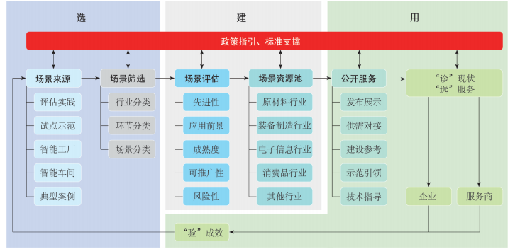 數(shù)字化場景資源池建設(shè)的關(guān)鍵是對外服務(wù),以示范、參考、指導(dǎo)等方式助力企業(yè)數(shù)字化場景建設(shè)。可以通過平臺的方式公開發(fā)布優(yōu)秀場景案例、場景提供方名錄、技術(shù)邏輯方案等信息,為轉(zhuǎn)型企業(yè)和服務(wù)商打造精準(zhǔn)高效的資源獲取和服務(wù)對接平臺。有轉(zhuǎn)型需求的企業(yè)可以通過信息發(fā)現(xiàn)、場景對比分析,“診”自身場景數(shù)字化現(xiàn)狀,快速錨準(zhǔn)具體轉(zhuǎn)型場景,明確轉(zhuǎn)型方案和目標(biāo),同時“選”優(yōu)秀場景案例指導(dǎo)自身場景數(shù)字化建設(shè)。服務(wù)商可以通過場景對標(biāo)分析,“診”自身數(shù)字化場景方案的成熟度和能力,“選”與自身同方向的優(yōu)秀場景指導(dǎo)方案優(yōu)化,持續(xù)提升服務(wù)能力。企業(yè)和服務(wù)商的成功實(shí)踐通過“驗”之后,將不斷轉(zhuǎn)化為資源池的場景來源,形成“選”“建”“用”的良性閉環(huán),不斷豐富資源池場景。