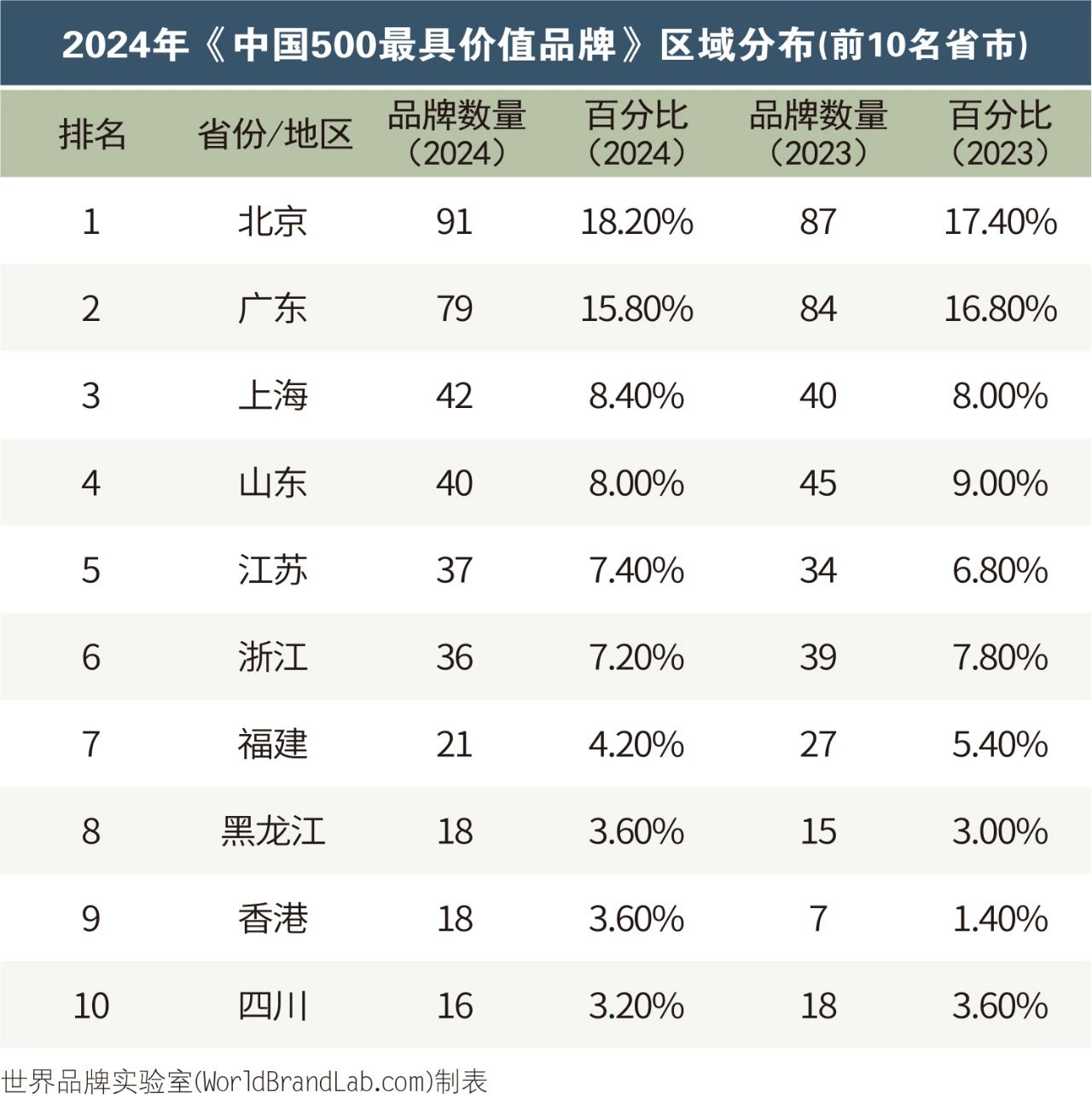 據(jù)世界品牌實(shí)驗(yàn)室的專家組分析,一個(gè)區(qū)域的競爭實(shí)力,主要取決于其比較優(yōu)勢,而品牌效益直接影響著地區(qū)比較優(yōu)勢的形成和發(fā)展。品牌是一個(gè)地區(qū)發(fā)展的重要標(biāo)志,品牌與區(qū)域經(jīng)濟(jì)的增長是相互聯(lián)動(dòng)的。從本屆《中國500最具價(jià)值品牌》區(qū)域分布來看,北京有91個(gè)品牌入選,名列第一,因?yàn)橼A利能力強(qiáng)的央企總部集中在北京;廣東和上海分別有79個(gè)和42個(gè)品牌入選,位居第二和第三。根據(jù)入選品牌影響力范圍大小,可按照全國性、世界性品牌進(jìn)行劃分。榜單中具有全國范圍影響力的品牌有431個(gè),占86.20%;具有世界性影響力的品牌數(shù)為69個(gè),占13.80%。