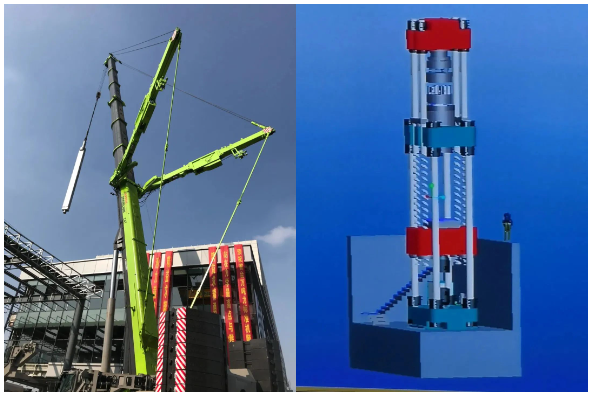 100MN力標準機裝置的總重量約500噸,其中最重的結構件約80噸,四根方立柱的長度近12米,約30噸/根,需從20米高的安裝孔中垂直吊裝進入場地,并直接安裝就位。不僅安裝難度極高,而且由于結構件重量重、長度長,吊裝存在較大安全風險。項目研發(fā)團隊通過反復驗算、建模,并結合實地測量,最終確定了安裝施工方案和安全防護方案。2021年1月25日,隨著四輛巨型運輸車抵達自儀院松江分院,項目迎來了最為重要的建設環(huán)節(jié)——力標準機主體設備吊裝。