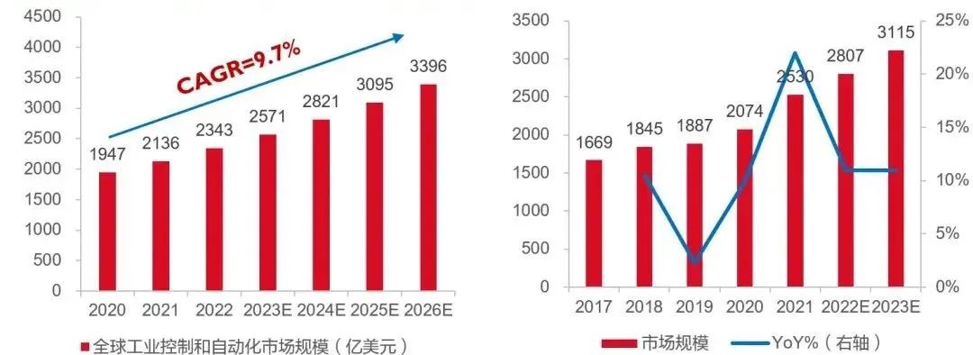 左圖:2020-2026E全球工控和自動(dòng)化市場(chǎng)規(guī)模(億美元)