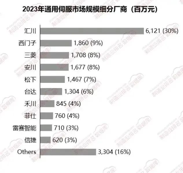從2023年的銷售額數(shù)據(jù)來(lái)看,通用伺服市場(chǎng)呈現(xiàn)出較高的集中度,前五家廠商的市場(chǎng)份額超過(guò)60%。其中,匯川以30%的市場(chǎng)份額位居第一,領(lǐng)先于西門子、三菱等國(guó)際品牌。